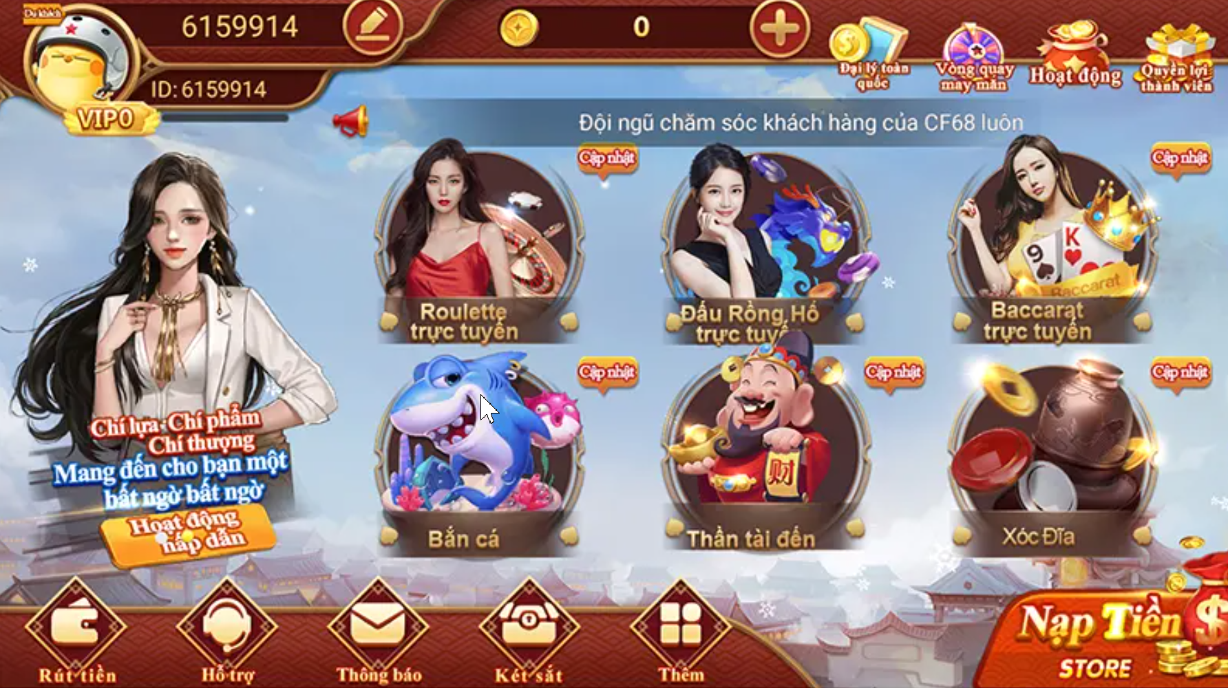 Bên cạnh đó, bố cục thông minh và hợp lý của CF68 giúp người chơi dễ dàng tìm thấy trò chơi yêu thích chỉ trong vài thao tác đơn giản. Âm thanh trong game cũng được chú trọng, giúp tận hưởng niềm vui trọn vẹn trong từng phút giây.